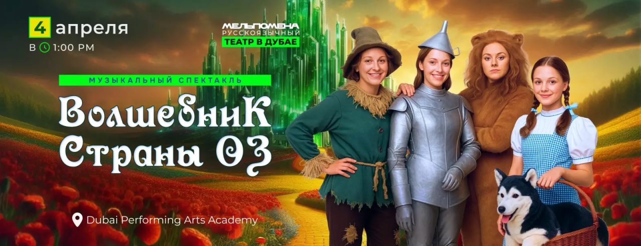 On Saturday, April 4, 2026, Волшебник страны Оз is scheduled at Dubai Performing Arts Academy in Dubai, with doors at 12:30 pm and the show starting at 1:00 pm. The live ticket page places the venue at 5 E6 Street, Jumeirah Park, Dubai, United Arab Emirates, while Dubai British School Jumeirah Park, the academy’s home campus, uses Al Warood St 1, Jumeirah Park, Dubai for the same location. For enquiries, Dubai Performing Arts lists +971 56 173 7545, and Dubai British School Jumeirah Park lists +971 4 552 0247. Tickets currently start from approximately AED 140 and rise to about AED 300, depending on category. This 70-minute family production is rated 2+ and is suitable for children, parents, and grandparents alike.