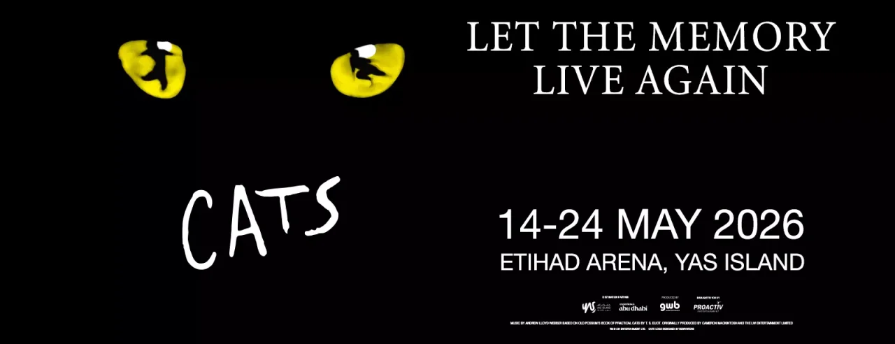 Cats will run at Etihad Arena, Yas Bay, Yas Island, Abu Dhabi, from Thursday, 14 May 2026 to Sunday, 24 May 2026. For venue help, guests can call 600 511 115 or (+971) 2 496 8000, and WhatsApp support is available on (+971) 56 351 5381. The official venue address is Etihad Arena, Yas Bay, Yas Island, Abu Dhabi, UAE, which helps if you are arranging a taxi or planning your route early. Ticket prices currently start at approximately AED 90 on weekdays and AED 160 on weekends, while the highest listed categories reach approximately AED 840 on weekdays and AED 910 on weekends. The current listing also shows a running time of 2 hours and 45 minutes, so this is a full theatre outing rather than a short family show. (suitable for couples, suitable for solo visitors, family-friendly for children aged 6+ with supervision)