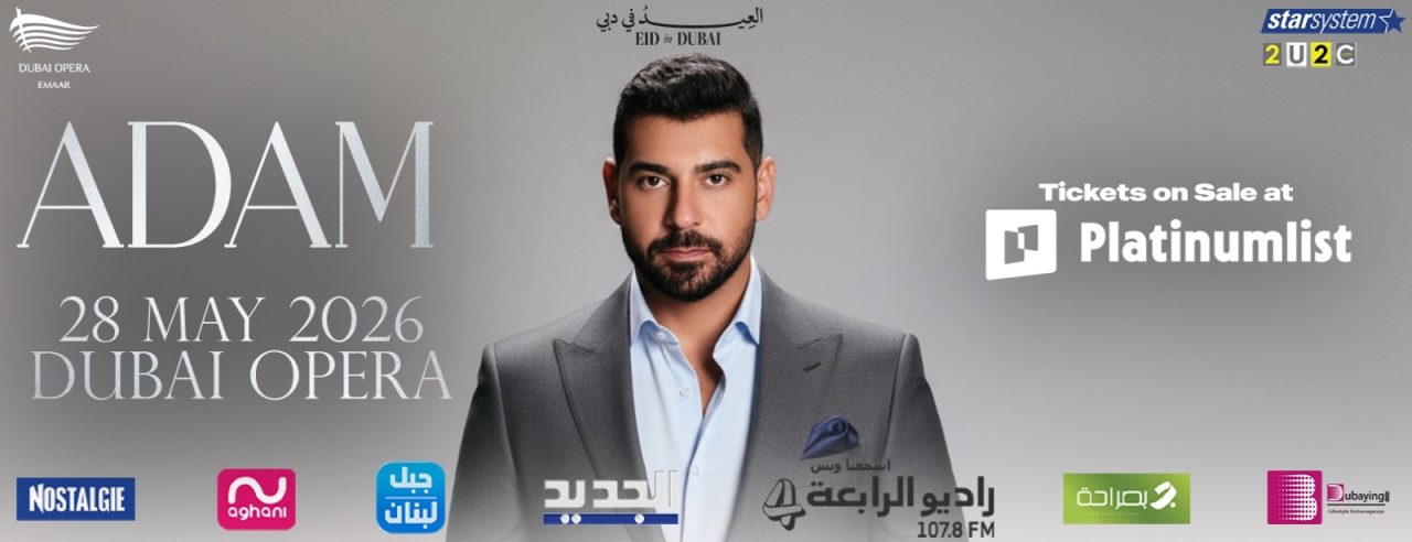 Adam Live in Concert will take place at Dubai Opera in Downtown Dubai on Thursday, 28 May 2026, at 9:00 PM. The venue is located on Sheikh Mohammed bin Rashid Boulevard, Downtown Dubai, Dubai, and the box office can be reached on 04 440 8888. Doors open 30 minutes before the show starts, so guests should arrive early for ticket checks and seating. Tickets currently start from approximately AED 295, with availability changing according to demand. This Arabic-language concert is suitable for couples, solo visitors, groups of friends, and fans of contemporary Arabic music.