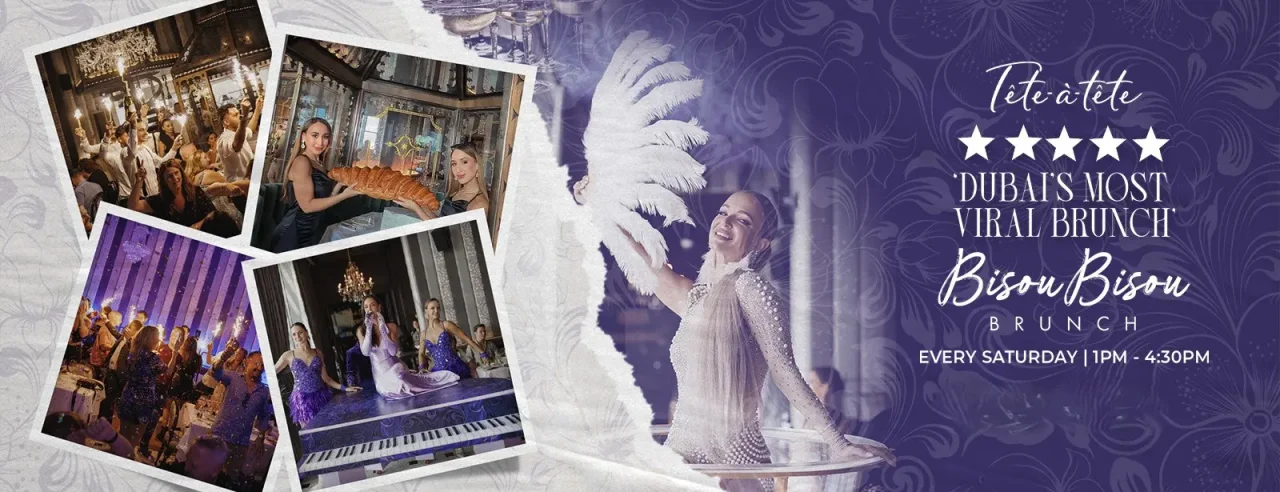 Bisou Bisou Brunch takes place every Saturday at Tête-à-Tête, 9th floor, FIVE LUXE JBR, The Walk, Jumeirah Beach Residence, Dubai, United Arab Emirates. For reservations and dining enquiries, the venue lists +971 58 900 9834, while FIVE LUXE JBR also lists +971 4 275 9999 for general enquiries and +971 4 455 9989 for restaurant calls. The brunch currently runs from 1:00 PM to 4:30 PM every Saturday, and packages start from approximately AED 350 per person. The official menu options begin with AED 350 for a three-course sharing menu with soft drinks, then rise to AED 450 with house beverages and AED 550 with house beverages and Prosecco. This is a stylish adult brunch rather than a family plan, and current ticketing pages list it for guests aged 21 and above. (best for couples, suitable for groups of friends, suitable for solo adults)