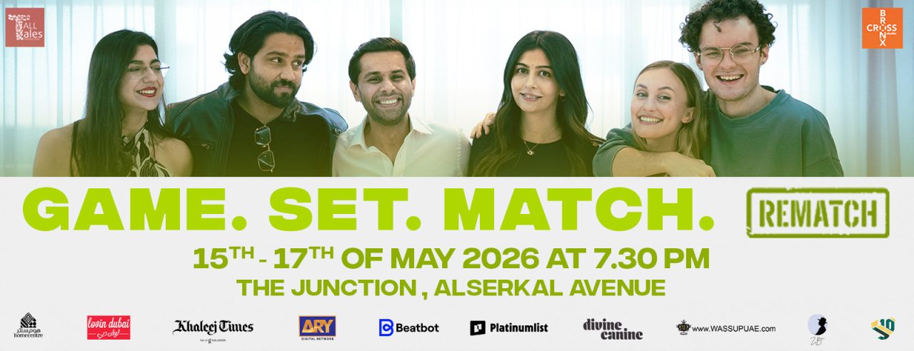 Dubai’s May theatre calendar includes the return of Game. Set. Match at The Junction in Alserkal Avenue, with the rerun scheduled from Friday, 15 May 2026, to Sunday, 17 May 2026. The production is staged at The Junction, Unit H72, Alserkal Avenue, 17 Street corner 8 Street, Al Quoz, Dubai. For venue enquiries, The Junction is listed at +971 4 338 8525, while the venue’s regular public hours run from Monday to Saturday, 10:00 AM to 5:00 PM, with later opening during show times. Tickets were listed from approximately AED 105, and public event listings placed the range at about AED 105 to AED 125 before the run moved to sold out status. The play is performed in English and carries a 13+ age restriction, which makes it more suitable for teens, adults, couples, groups of friends, and solo theatre-goers.