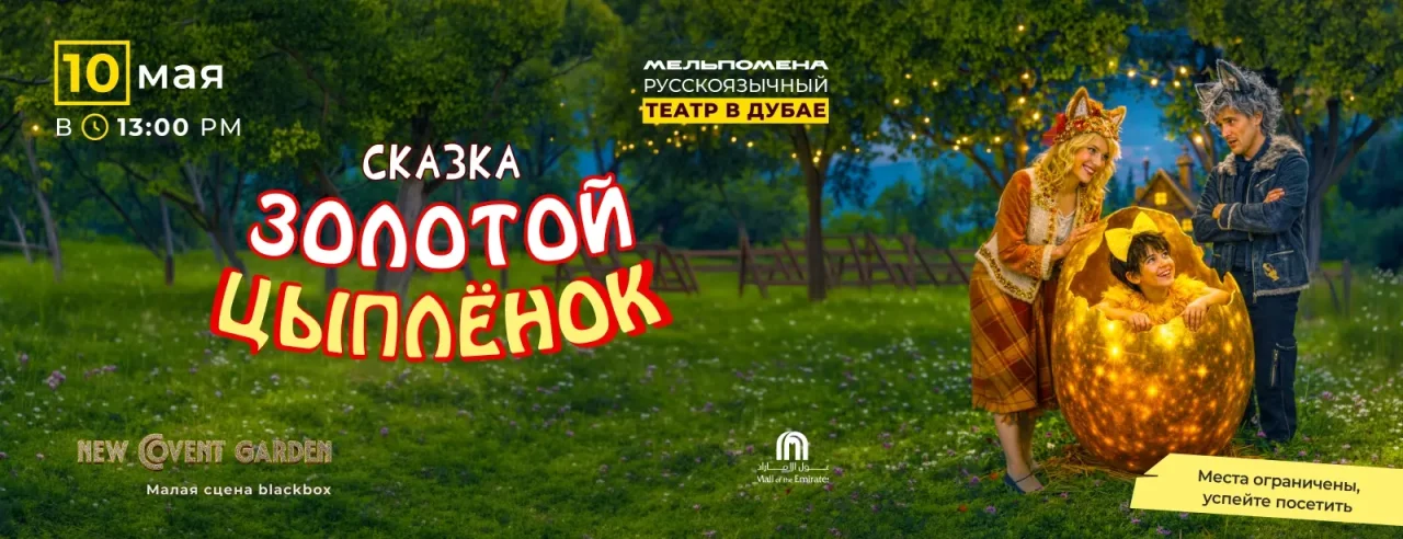 Dubai’s family theatre calendar adds a Russian-language stage performance on Sunday, 10 May 2026, when Golden Chick arrives at Playhouse Studio Theatre in Mall of the Emirates. Doors open at 12:30 PM and the show starts at 1:00 PM, with a running time of approximately 1 hour and 20 minutes. The venue sits at New Covent Garden Theatre, Level 2, Mall of the Emirates, Al Barsha 1, Sheikh Zayed Road, Dubai, and the listed contact number for the theatre is +971 4 296 6205. Mall of the Emirates customer service is also available on 800 663 6255. Tickets start from approximately AED 160, and the public listing marks the show as suitable for ages 2 and above.