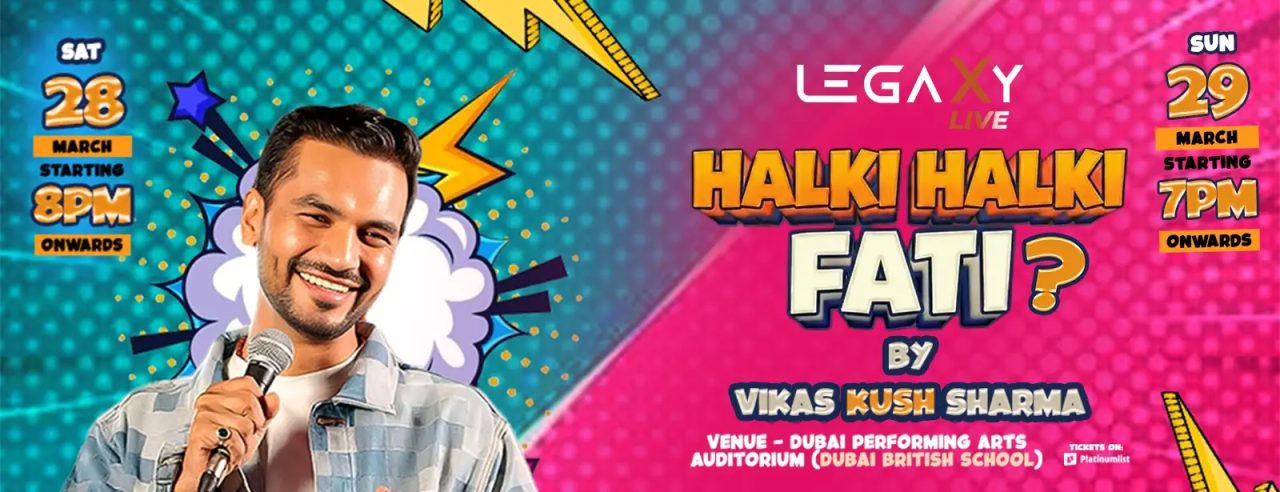 Dubai’s stand-up calendar for late March now includes Halki Halki Fati, the Vikas Kush Sharma show scheduled at the Dubai Performing Arts Auditorium, Dubai British School Jumeirah Park, Al Warood St 1, Jumeirah Park, Dubai, with the school reachable on +971 4 552 0247. Public ticketing pages currently show the event across Saturday, March 28 and Sunday, March 29, 2026, and one live listing specifically shows Sunday, March 29 from 7:00 PM onward, so buyers should confirm their selected date before checkout. Ticket prices currently start from approximately AED 99, which makes it one of the more accessible live comedy bookings on that weekend. This is a paid event and advance booking is the safer move. (suitable for couples, groups, solo; best for older teens and adults)