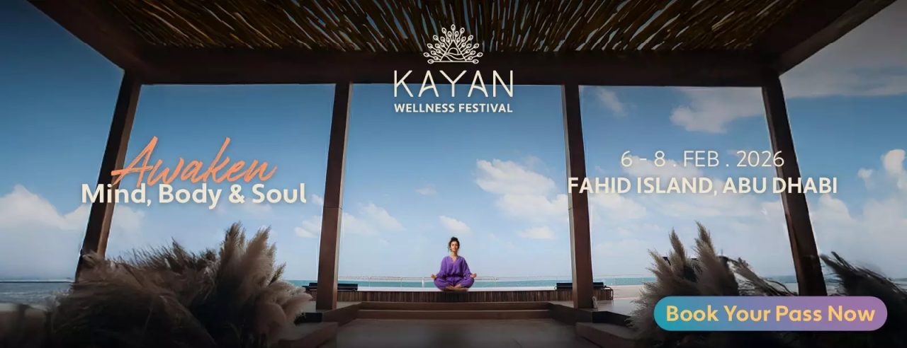 Kayan Wellness Festival returns to Fahid Island Beach, Abu Dhabi from Friday, February 6, 2026 to Sunday, February 8, 2026, running 10:00 am to 11:30 pm each day. Organisers list the main event contact as +971 58 164 1660, while the ticket hotline for pass support runs through +971 4 457 3212. The site sits on Fahid Island, accessed via Sheikh Khalifa Bin Zayed Street, and entry prices start from AED 95 approximately, depending on the pass you choose. Under-12s can enter free with an adult, although some kids activities carry an additional on-site fee.