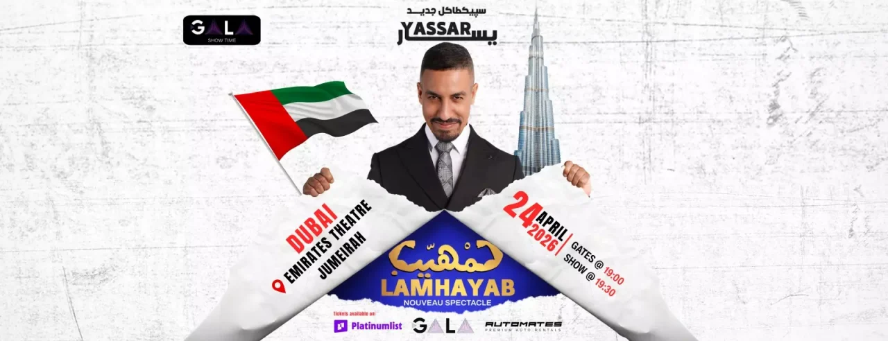 Lamhayab Yassar Lemghari is scheduled for Friday, 24 April 2026 at Emirates Theatre in Dubai, with doors opening at 7:00 PM and the show starting at 7:30 PM. The venue is listed as Emirates Theatre, Emirates International School, Jumeirah, Al Thanya Street, Dubai. For venue enquiries, Emirates International School Jumeirah lists +971 4 348 9804. Tickets are currently advertised from approximately AED 195. This is a Moroccan Darija comedy night, so the language is central to the experience rather than just a detail. (best for adults, suitable for couples, solo visitors, and groups who understand or enjoy Darija comedy)