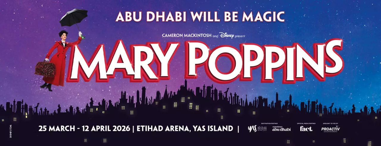 Mary Poppins The Musical lands at Etihad Arena, Yas Island, Abu Dhabi for a full run from Wednesday, 25 March 2026 to Sunday, 12 April 2026. The venue address is Etihad Arena, Yas Bay, Yas Island, Abu Dhabi, UAE, and visitors can use 600 511 115 or +971 2 496 8000 for venue support. For quick help on the day, many guests also use the venue’s WhatsApp +971 56 351 5381. Ticket prices are listed from approximately AED 150 up to approximately AED 830, depending on date, section, and availability. Tickets should be purchased through ETIHAD ARENA channels and PLATINUM LIST for the most reliable customer support. (family-friendly, suitable for couples, suitable for solo)
