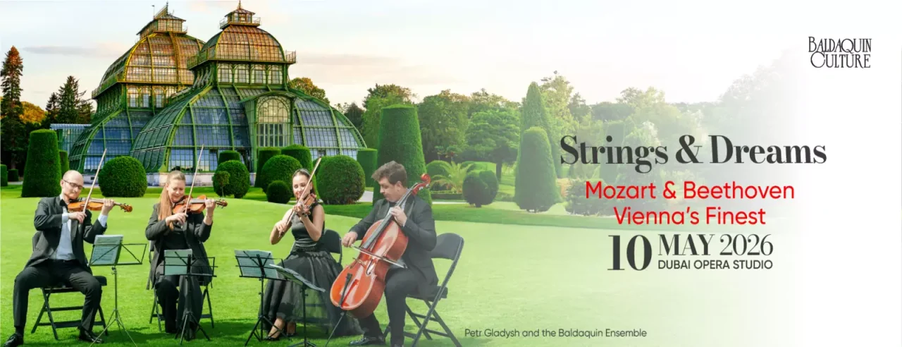 The performance comes from the Baldaquin Ensemble, with cellist Petr Gladysh, violist Anna Larionova-Gladysh, violinist Sergei Belozertsev, and violinist Daria Kuchenova forming the main quartet. Their competition history gives the event a serious musical profile, but the concept itself does not feel academic or distant. Instead, the series frames each concert as a journey through cities, composers, and moods, which makes it easier for broader audiences to connect with the repertoire. This is the kind of programme that suits both dedicated classical listeners and newcomers who want a refined but accessible night out. Alongside the music, Dubai-based artist Alena Lavdovskaya will present original works inspired by the emotional atmosphere of the series, and those pieces will also be available for purchase during the event.