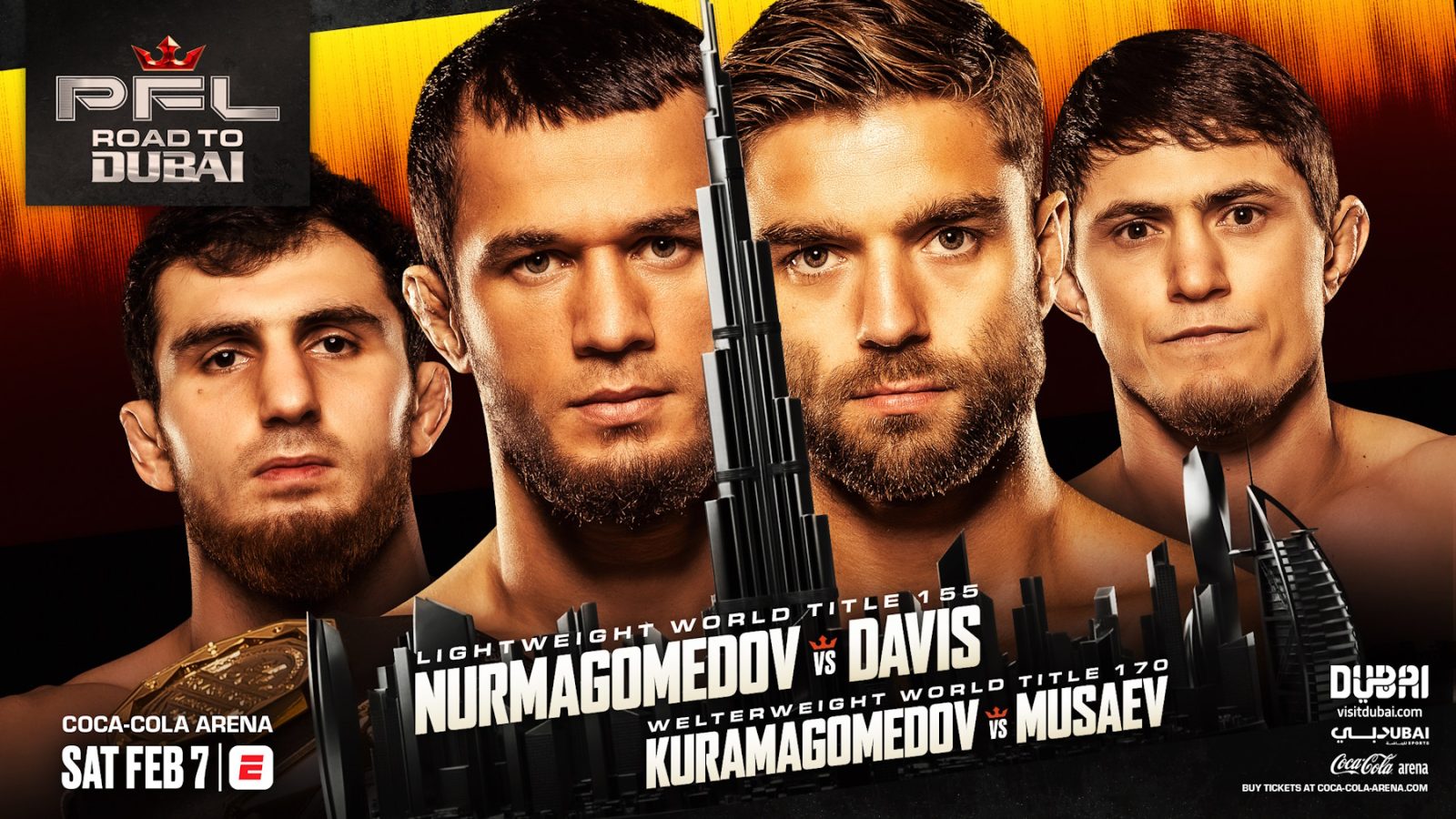 The updated PFL: Road To Dubai main card will take place at Coca-Cola Arena, Dubai, UAE, on Saturday, February 7, and will be available on ESPN App (U.S.) and Starzplay (MENA). The PFL Lightweight World Title main event features Usman Nurmagomedov (20-0-0, 1 NC) vs. Alfie Davis (20-5-1).