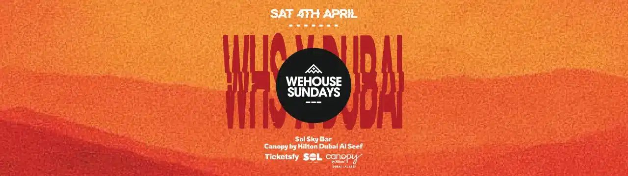 Dubai is set to welcome WeHouse Sundays Dubai Edition on Saturday, 4 April 2026, running from 1:00 PM to 12:00 AM at Sol Sky Bar. The venue sits at Canopy by Hilton Dubai Al Seef, Al Seef Street, Umm Hurair 1, Dubai, UAE, and the direct contact number is +971 58 200 5850. For venue email support, use dining.alseef@hilton.com, especially if you want to confirm table availability before you arrive. This is a 21+ event, so it is not suitable for children. Entry is listed from approximately AED 100 with an entry voucher that includes one drink.