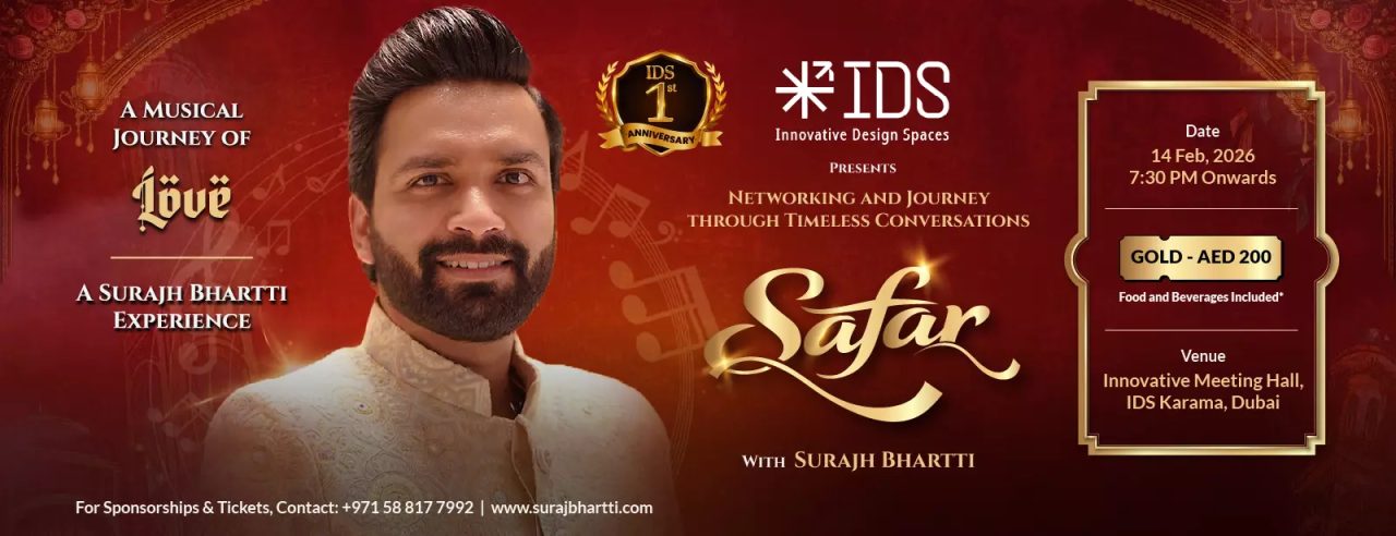 SAFAR arrives in Dubai at IDS Global Business Center, Innovative Meeting Hall, marking a reflective networking and music-led evening curated around conversation and connection. The gathering celebrates the first anniversary of Innovative Design Spaces, bringing together professionals, creatives, and culture enthusiasts in an intimate indoor setting. This is a curated, ticketed evening with limited capacity, designed for close interaction rather than large crowds. The experience is suitable for couples and solo guests, while it also appeals to professionals seeking meaningful dialogue. The venue sits within IDS Global Business Center, Dubai, a location known for refined interiors and calm ambience.