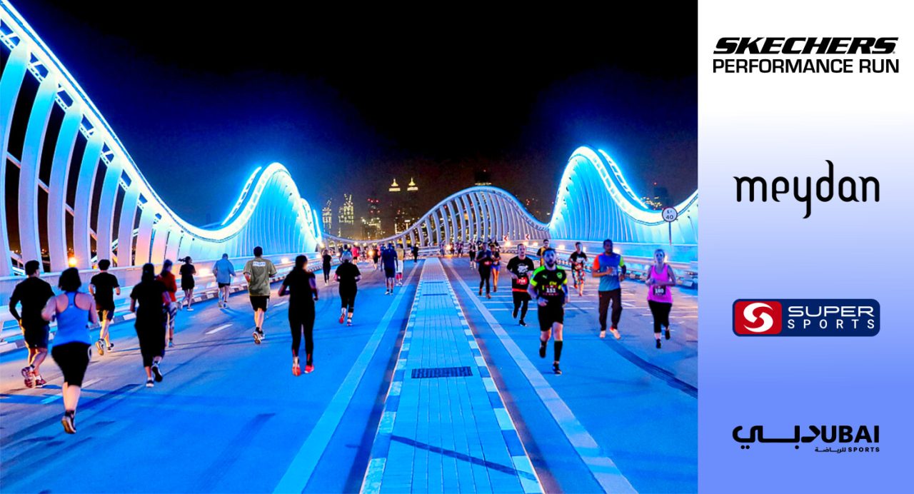 The SKECHERS Performance Night Run Race 3 takes place in Dubai on Wednesday, 18 February, beginning at 7:30 PM along the iconic Meydan Royal Bridge. The illuminated route stretches with views toward Sheikh Zayed Road, Business Bay, and the unmistakable silhouette of Burj Khalifa in the distance. This third race in the seasonal series blends competitive running with a vibrant nighttime city backdrop. Participants gather at the starting line on the bridge before heading out across clearly marked courses.