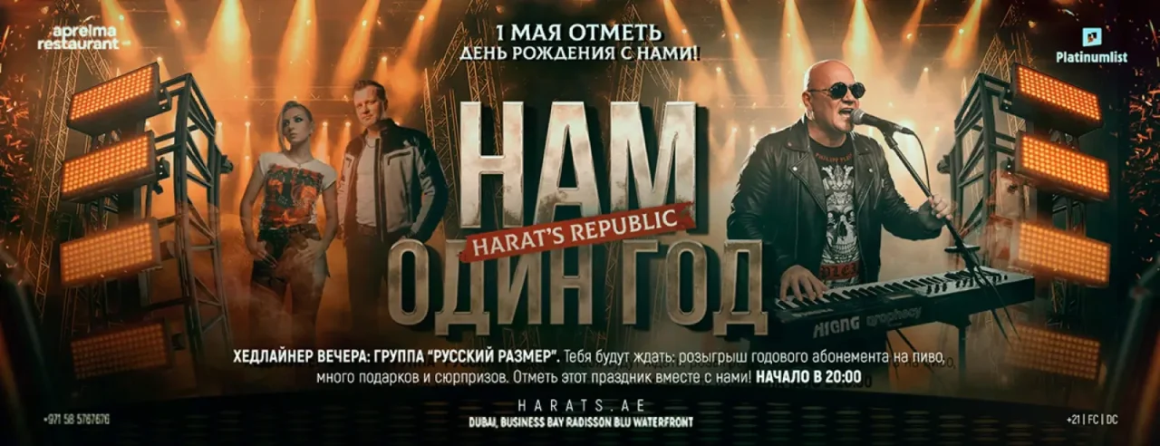 On Friday, May 1, 2026, Harat’s Republic in Business Bay is scheduled to mark its first anniversary with The Pub’s Birthday, a live celebration headlined by Russian Size. The venue is listed on the ground floor of Radisson Blu Hotel, Dubai Waterfront, at 6, 5 Street, Business Bay, Za’abeel, Dubai, and the pub’s published contact number is +971 58 576 7676. Doors are set for 6:00 pm, the show starts at 7:00 pm, and advertised tickets begin at approximately AED 200. For anyone planning ahead, this is a confirmed Friday-night concert event in one of Business Bay’s busier hospitality pockets. (best for adults, couples, groups, solo).